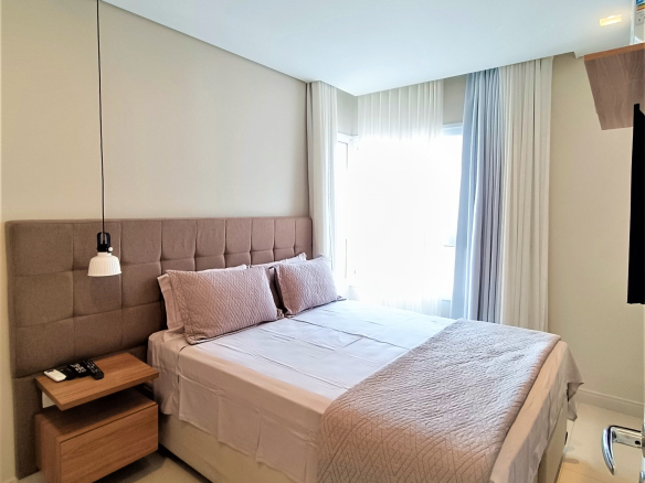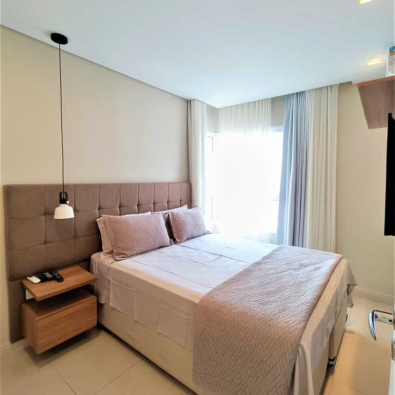 A iluminação foi projetada para que você tenha conforto e aproveite toda a luz natural que o apartamento também proporciona. No quarto, você encontrará uma espaçosa cama com enxoval de 400 fios, quatro travesseiros, almofadas e roupa de cama sempre impecável e confortável, para uma sensação relaxante e luxuosa, em todas as nossas hospedagens a roupa de cama é sempre higienizada por lavanderia profissional garantindo a qualidade do seu conforto,